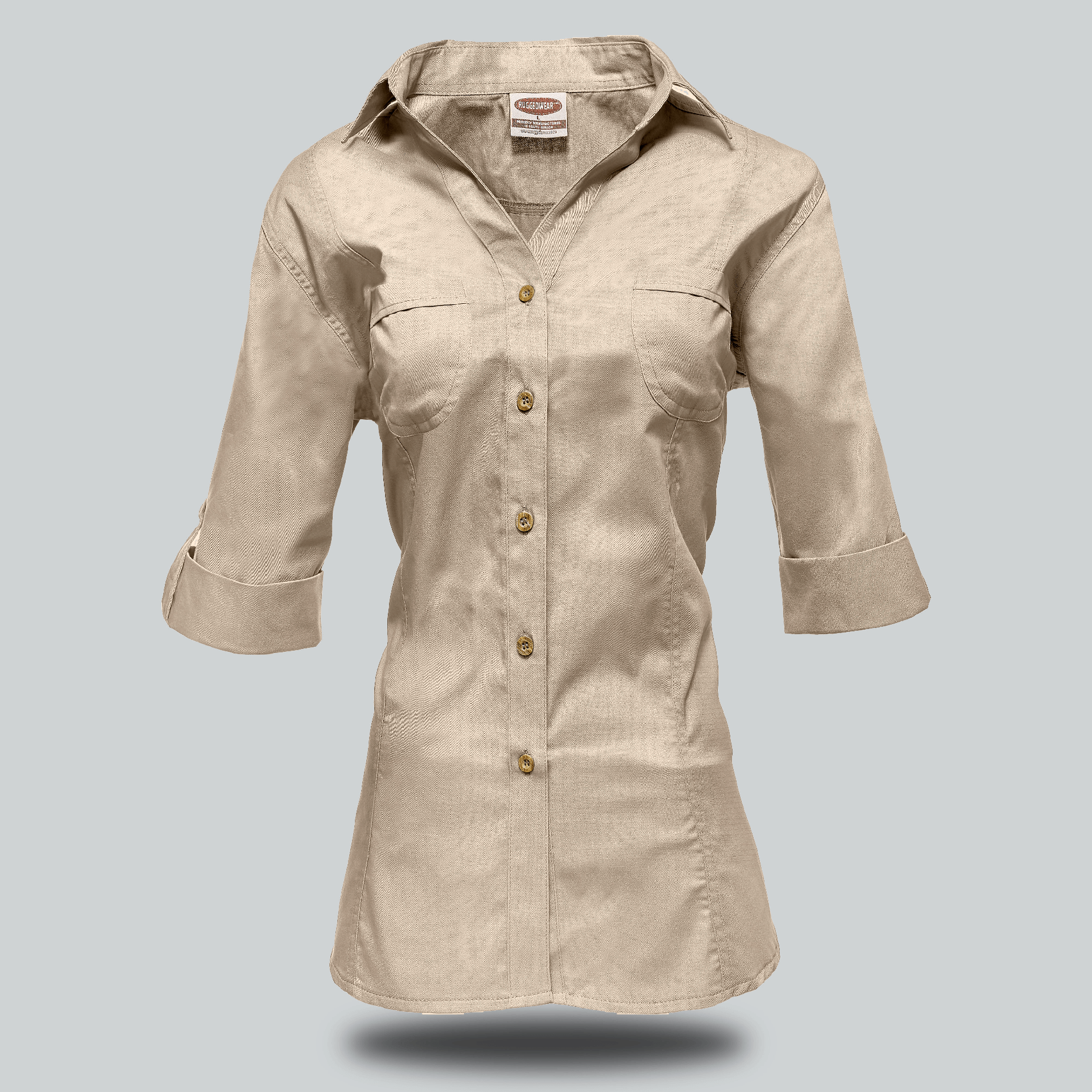 A fitted 100% cotton blouse with 3/4 sleeves, front pockets and flap detail on the back.
