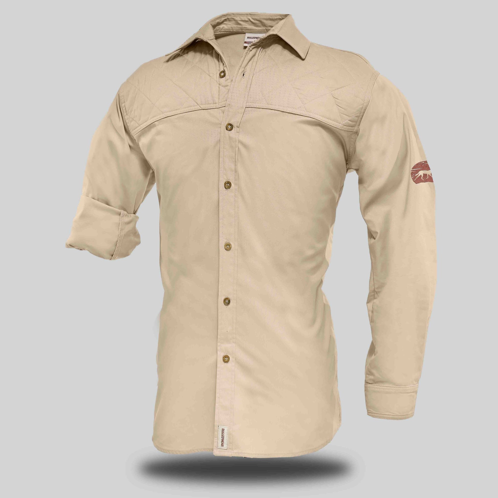 A long sleeve 100% cotton shirt with button tabs to keep rolled-up sleeves secured and padded shoulders for practicality and comfort.