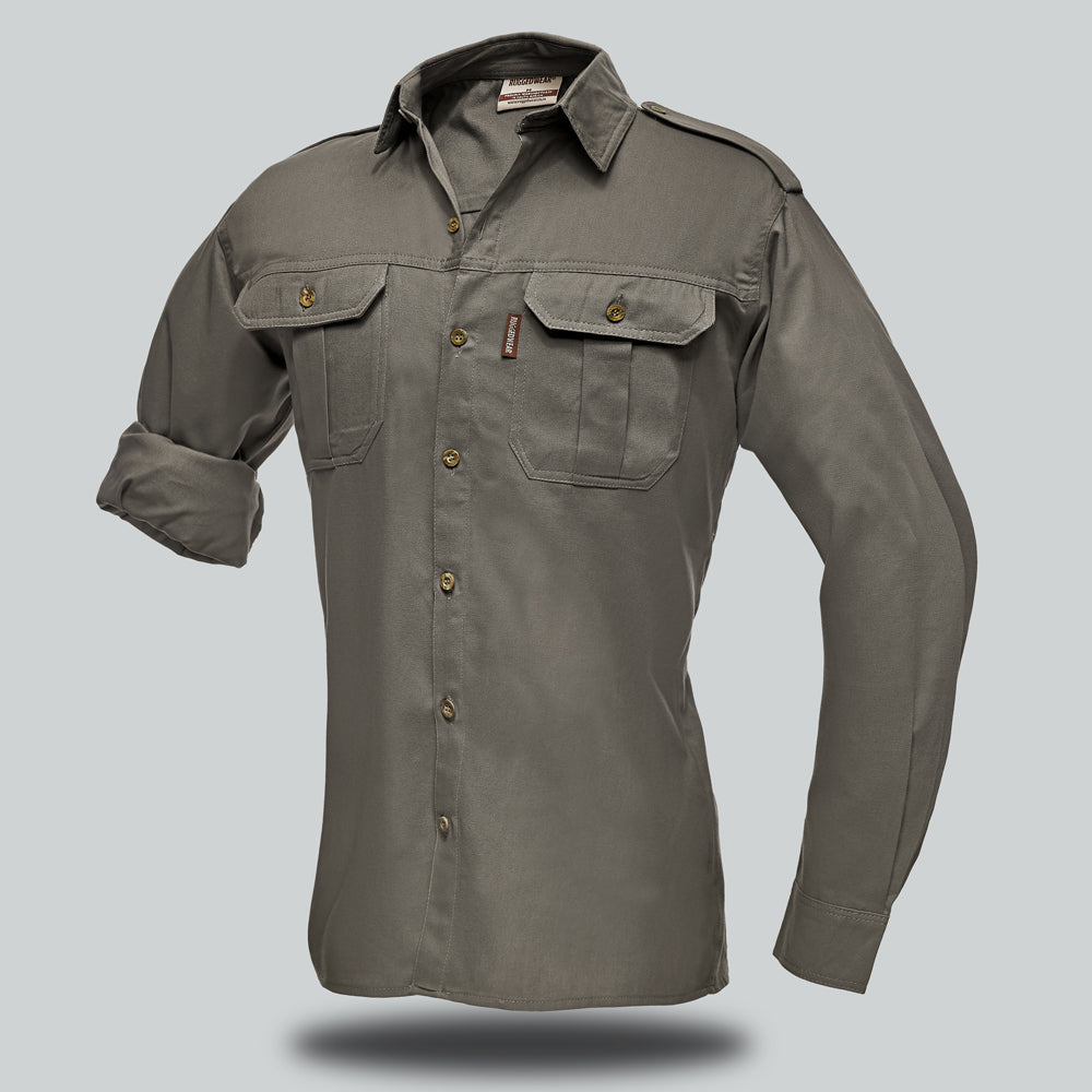 A 100% Cotton shirt with double pockets with button down flaps and epaulettes.