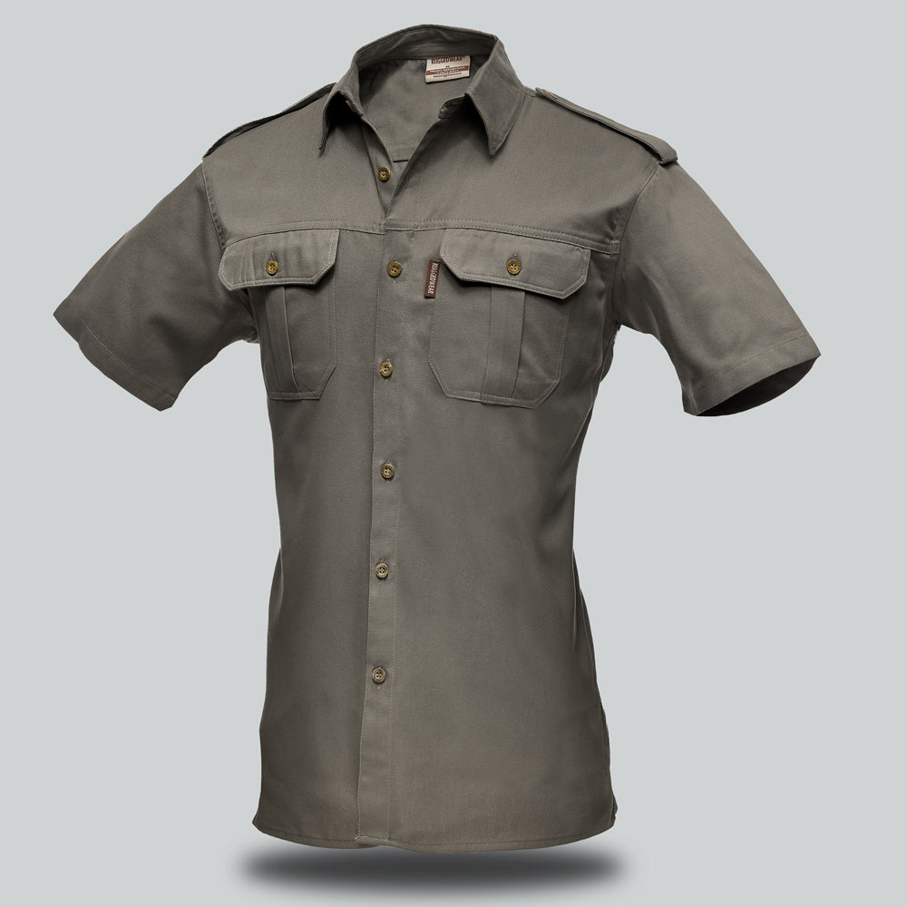 A 100% Cotton shirt with double pockets with button down flaps and epaulettes.