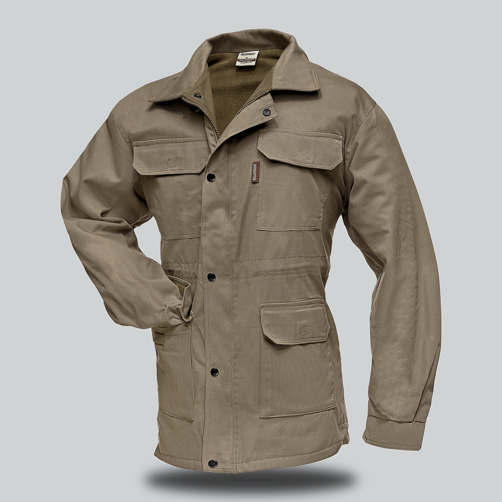 A Cotton fleece lined parka jacket, inner drawcord at the waist for adjustability and comfort. Full length zip and brass press studs, adjustable cuffed sleeves and six spacious pockets.