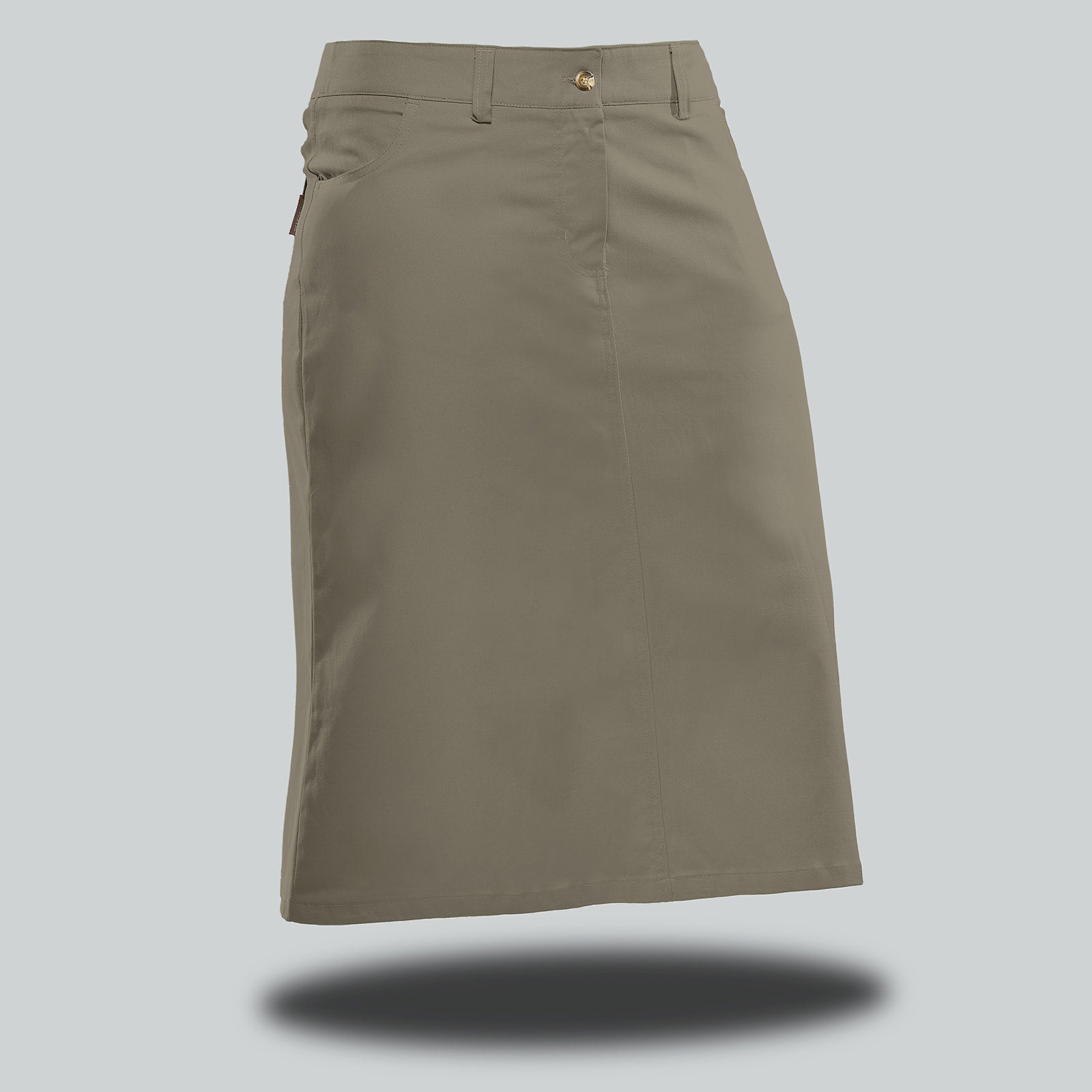 A 3/4 length (mid-calf) jean-style skirt with front zip, side and back pockets in cotton stretch fabric.