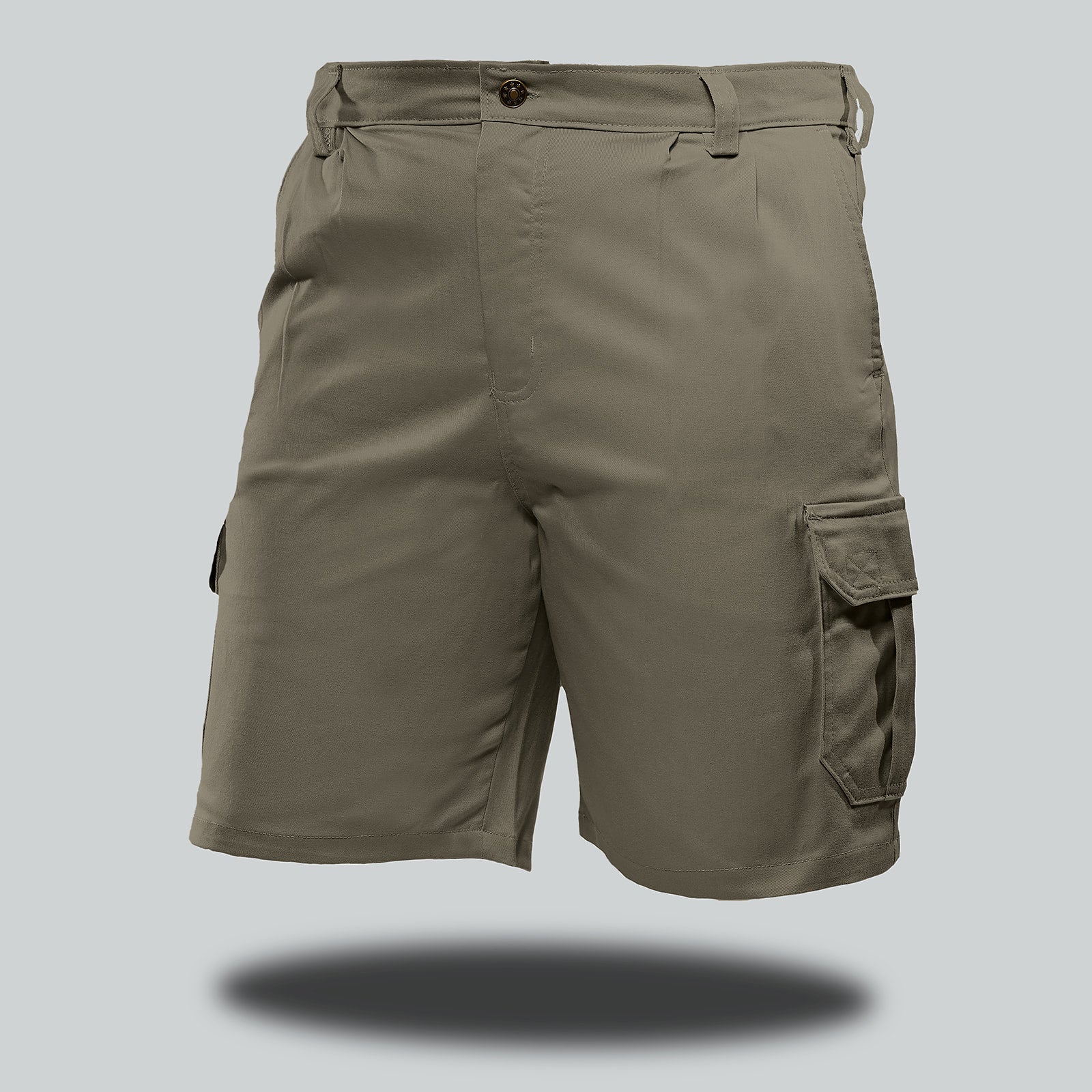 Longer length shorts with cargo pockets and pleated front, made with stretch cotton fabric.